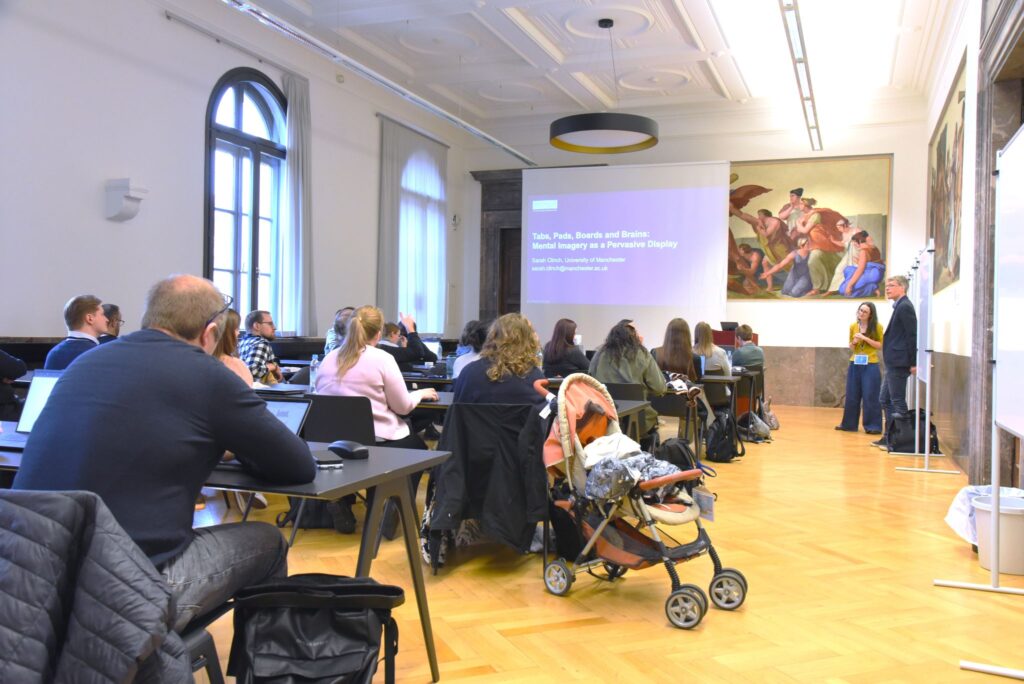 Ein besonderes Highlight der ACM PerDis 2026 war die inspirierende Keynote von Sarah Clinch von der University of Manchester (UK). In ihrem Vortrag „Tabs, Pads, Boards and Brains: Mental Imagery as a Pervasive Display“ lud sie dazu ein, den Begriff „Display“ neu zu denken – und zwar über physische und tragbare Technologien hinaus. Im Mittelpunkt stand dabei die Idee, dass das vielleicht allgegenwärtigste Display überhaupt unser eigenes inneres Vorstellungsvermögen ist. An der Schnittstelle von menschlicher Kognition und digitalen Systemen gab Sarah Clinch Einblicke in ihren Forschungsweg und entwarf eine spannende Vision für die Zukunft pervasiver Displays: Technologien, die nicht nur unsere Umgebung erweitern, sondern auch unser Denken unterstützen.